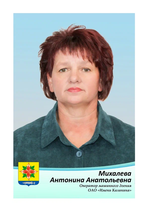 В хозяйстве ОАО «Имени Калинина» Антонина Анатольевна Михалева зарекомендовала себя как ответственный работник, добросовестно относящийся ко всем своим обязанностям. Добивается высоких показателей, внося весомый вклад в развитие сельского хозяйства. Постоянно совершенствует свои знания и опыт и в настоящее время является первоклассным специалистом. Строго соблюдает правила машинного доения коров. За годы работы не имеет нарушений трудовой и технологической дисциплины, замечаний от руководства организации.